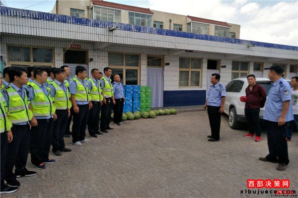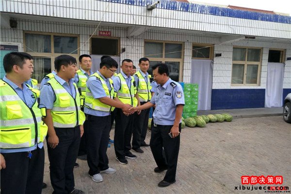 西部決策網(wǎng)訊( 鄒坤 通訊員 崔春月) 時(shí)值夏日,天氣持續(xù)高溫,2016年8月10日下午,靖邊縣公安局黨委委員、交警大隊(duì)長(zhǎng)王世崗、辦公室主任黃瑞峰等一行來到該大隊(duì)城區(qū)二中隊(duì)慰問在高溫酷熱天氣下堅(jiān)守崗位的一線民警,深刻表達(dá)了大隊(duì)黨委對(duì)一線民警的關(guān)心和關(guān)愛,并將防暑降溫物品及時(shí)送到了一線民警手中。