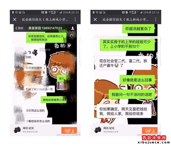 近日,一則題為《延安微信招生(3.2萬保上新城小學(xué))請相關(guān)部門給予調(diào)查公布真相》的帖子在朋友圈瘋傳,內(nèi)容是一位微信名叫“延安微信招生(保上新城小學(xué))”的微友,聲稱只要花3.2萬元,保證可以在新區(qū)小學(xué)入學(xué),并解釋有中間人,錢并不是直接給校長王紅霞,但愿意提供自己的車號(hào)、身份證號(hào)、家庭住址等信息作為擔(dān)保。3.2萬真的能夠保上延安新區(qū)小學(xué)嗎?事情真相究竟如何,記者展開調(diào)查。