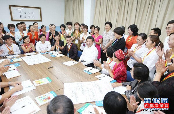 ?。?014年9月9日,習(xí)近平來到北京師范大學(xué)看望教師學(xué)生,向全國廣大教師和教育工作者致以崇高的節(jié)日敬禮和祝賀。這是習(xí)近平同正在北師大參加“中小學(xué)教師國家級培訓(xùn)計劃”的貴州小學(xué)骨干語文教師交流。新華社記者姚大偉攝)