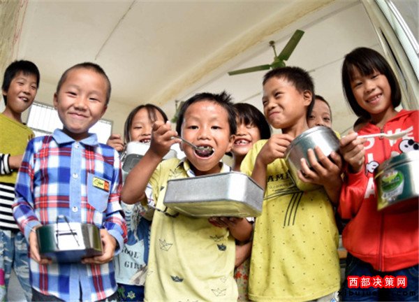 10月10日,在廣西大化瑤族自治縣七百弄鄉(xiāng)弄雄小學,同學們在吃營養(yǎng)餐。