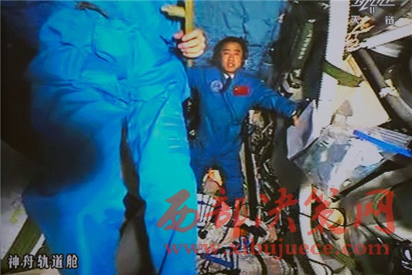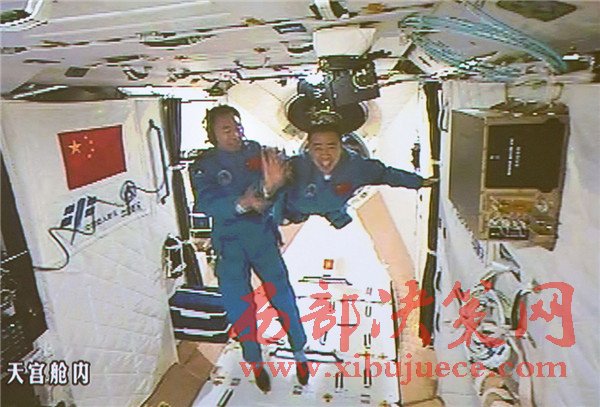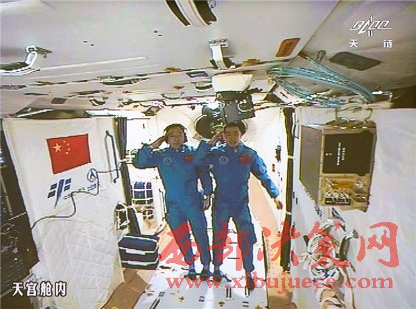 10月19日,神舟十一號(hào)航天員景海鵬和陳冬順利進(jìn)入天宮二號(hào)實(shí)驗(yàn)艙。景海鵬(左)和陳冬在天宮二號(hào)實(shí)驗(yàn)艙向全國人民問好并敬禮(攝于北京航天飛行控制中心大屏幕)。