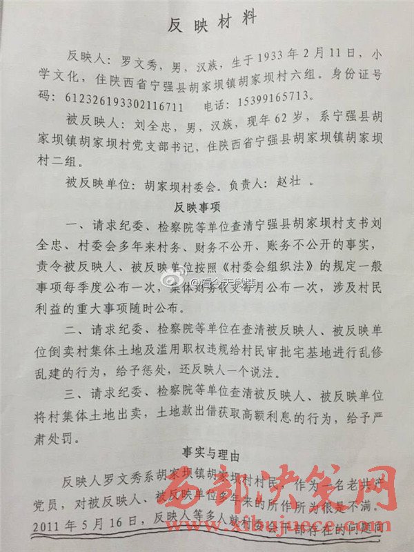 西部決策網(wǎng)訊 近日,有網(wǎng)友微博爆料,陜西省漢中市寧強(qiáng)縣胡家壩鎮(zhèn)胡家壩村,村干部劉全忠利用惠民政策,套取國家大量資金。對于國家扶貧項目,巧立名目、貪污、侵占村民利益。濫用職權(quán)違規(guī)審批宅基地,倒賣村集體土地,并將村上千萬余元出借他人賺取利息,且村務(wù)不公開、賬務(wù)弄虛作假、嚴(yán)重違紀(jì)行為。