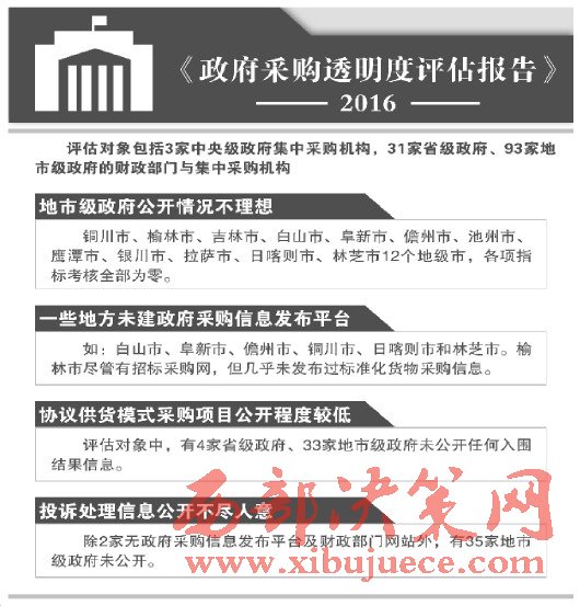 《報(bào)告》披露:我國(guó)政府采購(gòu)信息公開(kāi)情況仍不理想。主要表現(xiàn)為:地市級(jí)政府公開(kāi)情況不佳。其中,陜西省銅川市、榆林市、吉林省吉林市、白山市、遼寧省阜新市、海南省儋州市、安徽省池州市、江西鷹潭市、寧夏銀川市以及西藏拉薩市、日喀則市和林芝市等12個(gè)地級(jí)市,在政府采購(gòu)信息透明度各項(xiàng)指標(biāo)考核中全部為零分,在93家地市級(jí)政府成績(jī)排比中墊底。