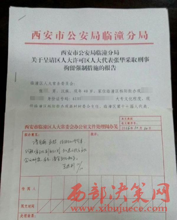 相關(guān)人士向澎湃新聞提供的一份西安市公安局臨潼分局關(guān)于“呈請區(qū)人大許可區(qū)人大代表張華采取刑事拘留強制措施”的報告顯示,張華,男,家住臨潼區(qū)櫟陽街辦觀高村第六組,現(xiàn)任臨潼區(qū)櫟陽街辦觀高村村委會主任,臨潼區(qū)第十七屆人大代表。上面還附有西安臨潼區(qū)人大常委會辦公室文件處理閱辦箋的擬辦意見:“需研究決定”。