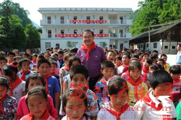 (2013年,葉其超到遵義市務(wù)川縣涪洋鎮(zhèn)雙河小學看望學生,他們身后的新樓是葉其超捐款50萬元援建的希望食堂、宿舍。)