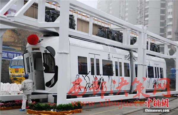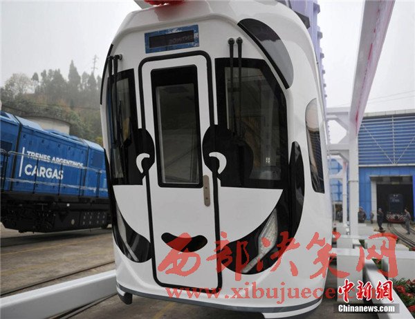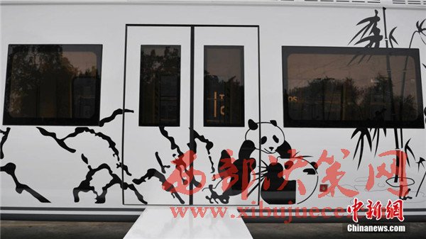 記者在現(xiàn)場(chǎng)看到,正式下線的空鐵車身為卡通熊貓山水圖案,酷似“熊貓”,每列定員144人,時(shí)速最高可達(dá)65公里。列車采用“大容量動(dòng)力蓄電池充放電控制技術(shù)”,通過實(shí)現(xiàn)高倍率放電,提高列車起動(dòng)加速性能及對(duì)極限環(huán)境的適應(yīng)性,同時(shí)能將400千瓦的電制動(dòng)功率全部用于動(dòng)力電池快速充電,實(shí)現(xiàn)制動(dòng)能量回收再利用,延長蓄電池續(xù)航里程達(dá)120千米。圖為車身外繪制有熊貓山水圖案。
