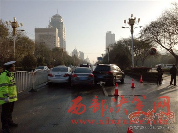 12月6日上午8時(shí)許,在渭南市區(qū)朝陽大街與三賢路丁字以西,約300米長的東向車道十分濕滑,共有16輛車接連發(fā)生交通事故