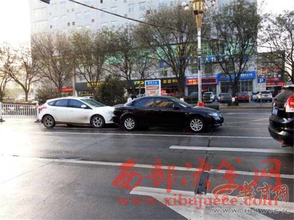 12月6日上午,在朝陽大街與三賢路丁字,兩輛轎車因路面結(jié)冰發(fā)生追尾