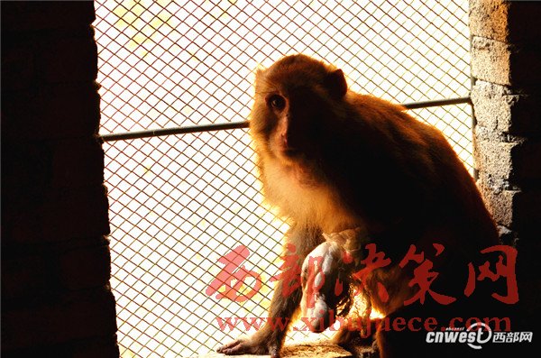 2016年12月8日,左前臂手術(shù)后的獼猴跳到寧強(qiáng)縣野生動(dòng)物救助中心的窗戶上警惕地看著工作人員。