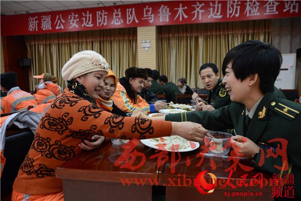 包餃子、聊家常、串門子……12月16日,新疆邊防總隊(duì)烏魯木齊邊防檢查站迎來(lái)了烏魯木齊市迎賓路街道辦的41位環(huán)衛(wèi)工人們,并與他們結(jié)成了對(duì)子,成為了“親戚”。
