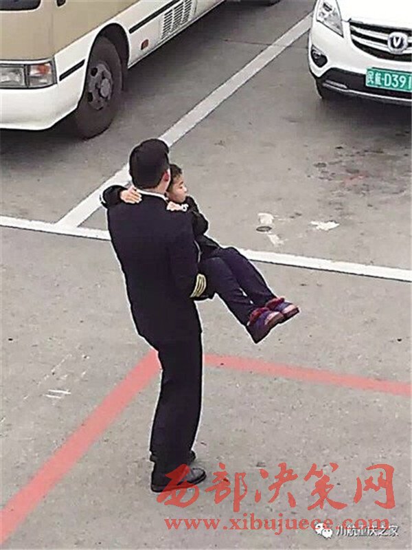 機長抱小男孩下飛機圖片刷爆朋友圈