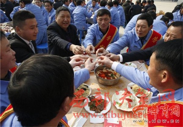 張興民介紹,在為大家發(fā)放了1600萬的工資后,工地上還為農(nóng)民工返鄉(xiāng)之前準備了聚餐。每個桌上不僅有自釀的“苞谷燒”,還有八涼兩熱的菜品,同時按照陜西風俗習慣準備的有大燴菜,僅大燴菜里面的肉都有500多斤,希望以此方式來感謝農(nóng)民工兄弟一年多的辛苦!