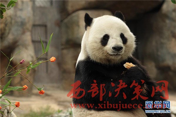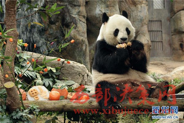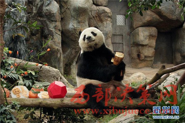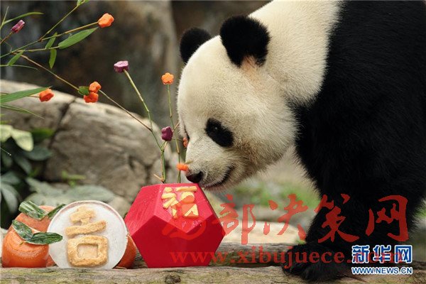 1月16日,在香港海洋公園,大熊貓樂(lè)樂(lè)準(zhǔn)備享用新春大餐。當(dāng)日,香港海洋公園的工作人員用紅薯、紫薯、胡蘿卜和竹筍為大熊貓樂(lè)樂(lè)精心制作新春大餐。