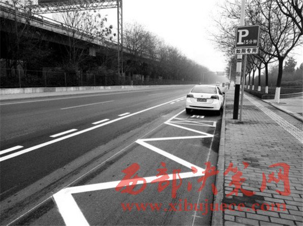 記者現(xiàn)場(chǎng)看到,如廁停車(chē)位大多緊鄰公廁,設(shè)置在道沿下的路邊,白色的波折線,前方設(shè)置一個(gè)或兩個(gè)臨時(shí)停車(chē)位,停車(chē)位采用黃色起止標(biāo)線,標(biāo)線內(nèi)寫(xiě)有“如廁專(zhuān)用”大字。緊鄰?fù)\?chē)位的路邊,設(shè)有牌,停車(chē)牌上寫(xiě)著“15分鐘”的停車(chē)時(shí)限。