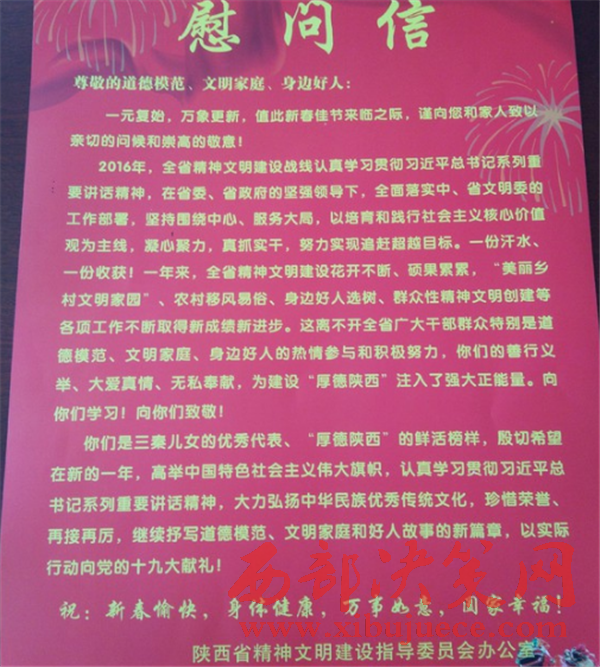 慰問組每到一戶都詳細詢問了模范們的家庭生產(chǎn)和生活狀況,囑咐他們保重身體,希望他們珍惜榮譽,再接再厲,繼續(xù)發(fā)揮模范帶頭作用,在道德建設上再樹新形象,再展新風采,再創(chuàng)新佳績。同時也號召全縣人民學好人、做好人,崇尚道德,弘揚善舉率先垂范,樹立榜樣。