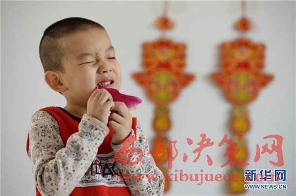 2月3日,河北省邢臺市橋東區(qū)三義廟社區(qū)的兒童在社區(qū)兒童娛樂室吃蘿卜“咬春”。