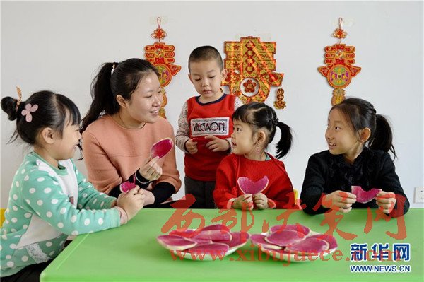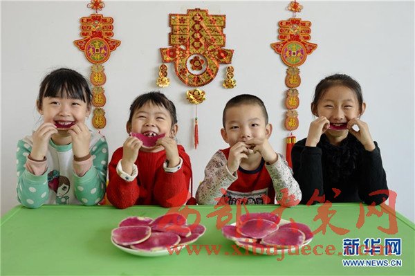 2月3日,河北省邢臺市橋東區(qū)三義廟社區(qū)的孩子們在社區(qū)兒童娛樂室吃蘿卜“咬春”。