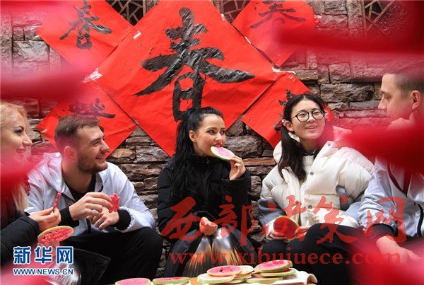 2月3日,在山東省臨沂市沂南縣竹泉村,來自俄羅斯的游客瑪麗婭(中)與同伴在開辦農(nóng)家樂的村民肖蕊(右二)家中吃生蘿卜,體驗“咬春”。