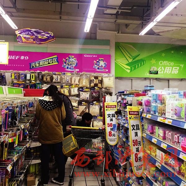 昨日記者在和平門外一超市二樓看到,入口處擺滿了本子、文具盒、書包等學(xué)習(xí)用具,“開學(xué)樂淘淘”的宣傳海報(bào)有“買50元,減8元”的優(yōu)惠活動(dòng)。