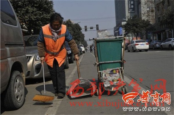 昨日中午12時(shí)許,周至縣南大街,66歲的姜益梅推著小車從路東邊在斑馬線處繞到路西邊,她邊走邊掃,不時(shí)還要繞過護(hù)欄去沿街商戶門前的人行道上轉(zhuǎn)一下。她已經(jīng)從凌晨5時(shí)工作到了現(xiàn)在,再過半小時(shí)同事會(huì)過來與她倒班。