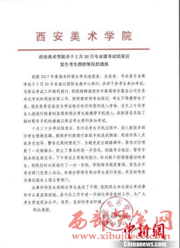西安美術學院發(fā)布的事件通報稱,考試結束后,在歸還手機過程中,因人數(shù)較多部分考生情緒急躁,推倒護欄欲強行拿取手機造成擁堵,現(xiàn)場安保人員在多次勸導、警告無果的情況下,為避免發(fā)生踩踏時間,緊急對空噴射了一次辣椒水,防止了事態(tài)的進一步惡化。經疏導分流后,暫存手機全部發(fā)放完畢,下午考試順利進行。針對個別情緒激動的考生,該院即使對其進行了一對一安撫。學院領導高度重視,緊急召開有關部門負責人會議,安排分管領導再對考生進行安撫,并及時將有關情況報告上級主管部門。此事件的發(fā)生給部分考生造成了不便,該院將從本次招生考試事件中認真汲取經驗,在今后工作中進一步細化考務組織工作,為廣大考生營造更加公平、有序、良好的考試環(huán)境。
