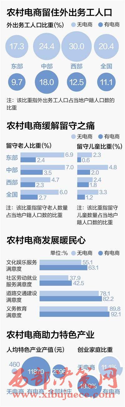 數(shù)據(jù)顯示:有電商村莊的留守老人和留守兒童的比重不到無(wú)電商村莊的一半;有電商村莊的村民對(duì)公共服務(wù)的滿意度更高。