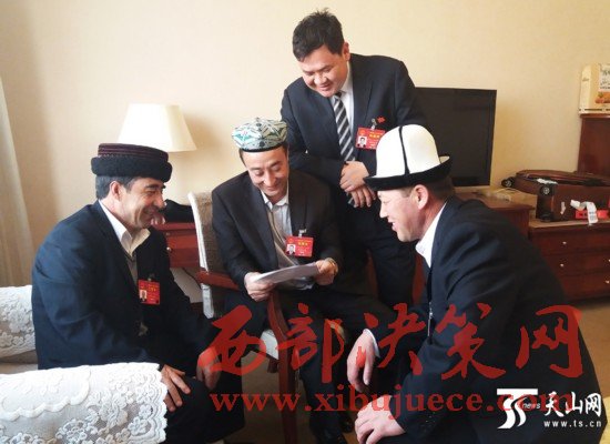 全國(guó)人大代表那布拉夏·胡加洪(左一)正在與全國(guó)人大代表麥麥提熱伊木·買買提明(左二)、牙生·吐爾遜(左三)、蘇力坦·加依那克(右一)交流。