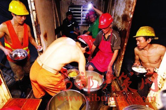 由于上下班路途較遠,工人們每個班要在隧洞內(nèi)工作18個小時左右。臨近中午,隧洞小火車送來了午飯。打開保溫桶,四菜一湯熱氣騰騰。兩葷兩素,米飯管飽,湯管夠。吃完飯,工人們又投入到了緊張的工作中去了,他們在期盼著把漢江水引到關(guān)中的那一天。