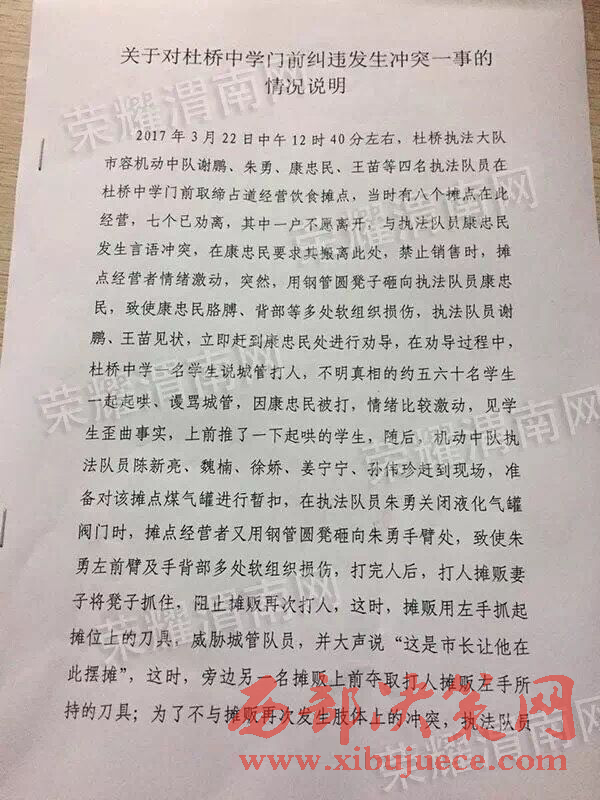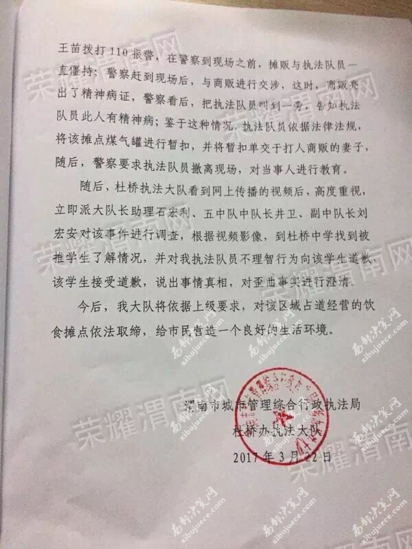 當(dāng)晚6點(diǎn)以后,涉事執(zhí)法隊(duì)員所屬執(zhí)法大隊(duì)杜橋執(zhí)法大隊(duì)書面回復(fù)便在網(wǎng)絡(luò)中被網(wǎng)友們不斷的轉(zhuǎn)載。據(jù)該回復(fù)稱:2017年3月22日中午12時(shí)40分左右,杜橋執(zhí)法大隊(duì)市容機(jī)動(dòng)中隊(duì)謝鵬、朱勇、康忠民、王苗等4名執(zhí)法隊(duì)員在杜橋中學(xué)門前取締占道經(jīng)營(yíng)飲食攤點(diǎn),當(dāng)時(shí)有八個(gè)攤點(diǎn)在此經(jīng)營(yíng),七個(gè)已勸離,其中一戶不愿離開(kāi),與執(zhí)法隊(duì)員康忠民發(fā)生言語(yǔ)沖突,在康忠民要求其搬離此處,禁止銷售時(shí),攤點(diǎn)經(jīng)營(yíng)者情緒激動(dòng),突然,用鋼管圓凳子砸向執(zhí)法隊(duì)員康忠民,致使康忠民胳膊、背部等多處軟組織損傷,執(zhí)法隊(duì)員謝鵬、王苗等見(jiàn)狀,立即趕到康忠民處進(jìn)行勸導(dǎo),在勸導(dǎo)過(guò)程中,杜橋中學(xué)一名學(xué)生說(shuō)城管打人,不明真相的約五六十名學(xué)生一起起哄、謾罵城管,因康忠民被打,情緒比較激動(dòng),見(jiàn)學(xué)生歪曲事實(shí),上前推了一下起哄的學(xué)生,隨后,機(jī)動(dòng)中隊(duì)執(zhí)法隊(duì)員朱勇、陳新亮、魏楠、徐嬌、姜寧寧、孫偉珍趕到現(xiàn)場(chǎng),準(zhǔn)備對(duì)該攤點(diǎn)煤氣罐進(jìn)行暫扣,在執(zhí)法隊(duì)員朱勇關(guān)閉液化氣罐閥門時(shí),攤點(diǎn)經(jīng)營(yíng)者用鋼管圓凳砸向朱勇手臂處,致使朱勇左前臂及手背部多處軟組織損傷,打完人后,打人攤販妻子將凳子抓住,阻止攤販再次打人,這時(shí),攤販用左手抓起攤位上的刀具,威脅城管隊(duì)員,并大聲說(shuō)“這是市長(zhǎng)讓他在此擺攤”,這時(shí),旁邊另一名攤販上前奪取打人攤販左手所持的刀具;為了不與攤販再次發(fā)生肢體上的沖突,執(zhí)法隊(duì)員王苗撥打110報(bào)警,在警察到現(xiàn)場(chǎng)之前,攤販與執(zhí)法隊(duì)員一直僵持;警察趕到現(xiàn)場(chǎng)后,與商販進(jìn)行交涉,這時(shí),商販亮出了精神病證,警察看后,把執(zhí)法隊(duì)員叫到一旁,告知執(zhí)法隊(duì)員此人有精神??;鑒于這種情況,執(zhí)法隊(duì)員依據(jù)法律法規(guī),將該攤點(diǎn)煤氣罐進(jìn)行暫扣,并將暫扣單交于打人商販的妻子,隨后,警察要求執(zhí)法隊(duì)員撤離現(xiàn)場(chǎng),對(duì)當(dāng)事人進(jìn)行教育。