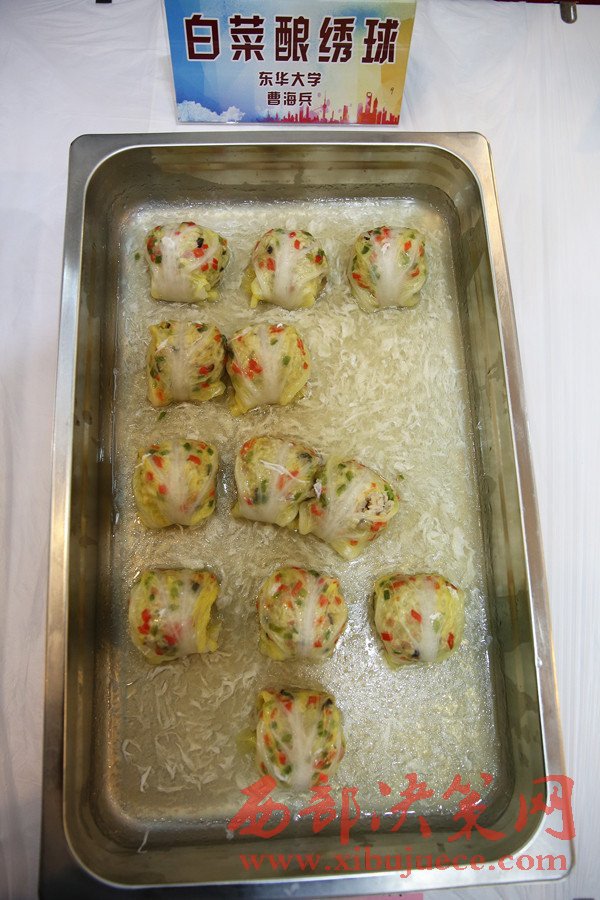 這次比賽的菜品以家禽類(lèi)菜肴和各式點(diǎn)心為主。譬如,上海師范大學(xué)廚師孫榮根以豆腐、鵝肝為原料,輔以松仁、香菜,現(xiàn)場(chǎng)制作出一碗碗“白玉鵝肝粒”。