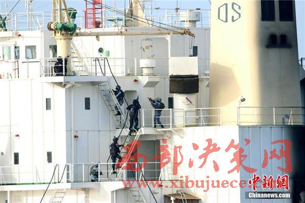 圖為特戰(zhàn)隊(duì)員快速登入商船展開營救活動(dòng)。