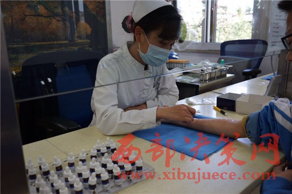 4月11日,北京大學(xué)世紀(jì)壇醫(yī)院變態(tài)反應(yīng)科化驗(yàn)室醫(yī)務(wù)人員在給患者做過(guò)敏源檢測(cè)。今年3月以來(lái),這個(gè)科室就診人數(shù)從平時(shí)的日均100多人猛增到300多人。新華網(wǎng)韓家慧攝
