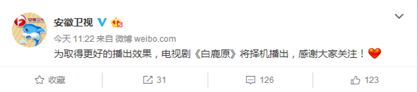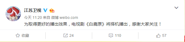 很多守在電視機前準備看《白鹿原》的觀眾都撲空了,江蘇衛(wèi)視和安徽衛(wèi)視原計劃播放第2集的時間卻各自播放了其他內(nèi)容,但兩方都未對《白鹿原》停播作出解釋。就在今日,兩家衛(wèi)視都官方發(fā)表聲明表示,“為取得更好的播出效果,電視劇《白鹿原》將擇機播出,感謝大家關(guān)注!”