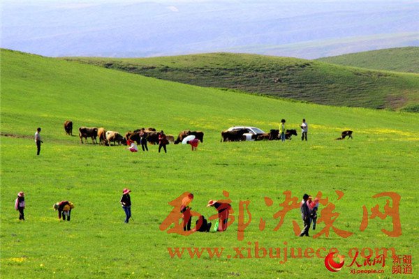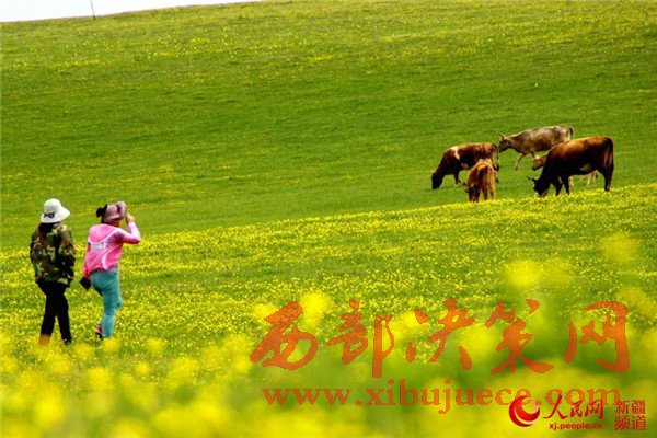 5月29日,游客在新疆裕民縣巴爾魯克山風(fēng)景區(qū)阿克喬克草原踏青賞花。