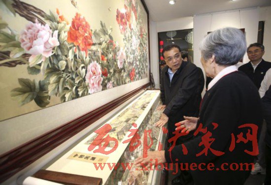 李克強(qiáng)2017年5月8日晚來到開封七盛角民俗文化街,在王素花汴繡館長(zhǎng)時(shí)間駐足。82歲的王素花多年繼承創(chuàng)新宋代傳統(tǒng)刺繡工藝,是汴繡領(lǐng)軍人物??偫碜屑?xì)觀賞后稱贊她用色“多而不雜”,技藝“爐火純青”。