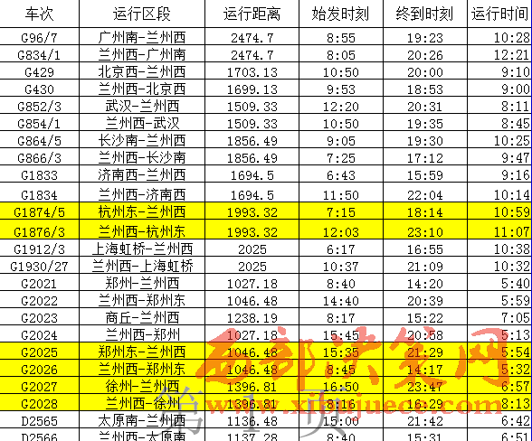 從寶蘭高鐵列車開行方案來看,蘭州西至北京西開行動車組列車1對,為列車雙向?qū)﹂_,共計運行1699公里,9:53從蘭州西站始發(fā),18:53達到北京西站,車次為 G430次,運行時間9小時整;10:50從北京西站始發(fā),20:00到達蘭州西站,車次為 G429次。蘭州西至廣州南開行動車組列車1對,為列車雙向?qū)﹂_,共計運行2474.7公里,8:05從蘭州西站始發(fā),20:26到達廣州南站,車次為 G834/1次;8:55從廣州南站始發(fā),19:23到達蘭州西站,車次為 G96/7次,運行時間10小時28分。蘭州西至上海虹橋站開行動車組列車1對,為列車雙向?qū)﹂_,共計運行2025公里,10:37從蘭州西站始發(fā),21:09到達上海虹橋站,車次為 G1930/27次,運行時間10小時32分;6:17從上海虹橋站始發(fā),16:55到達蘭州西站,車次為 G1912/3次。