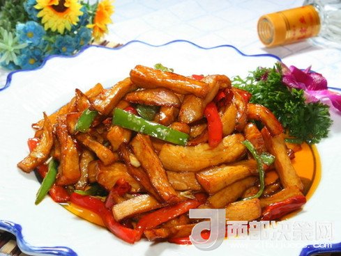 1. 將土豆削皮,切細(xì)絲,泡在水中洗去淀粉,既能避免其變黑,又能使其在炒燒時保持白嫩、爽脆。炒前撈出,瀝干水分。
