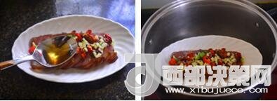 5、蒸鍋?zhàn)⑺疅_(kāi),放入臘肉,蒸制20分鐘至臘肉酥軟。