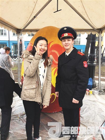 在俄羅斯的節(jié)日慶典活動中,姜若晨(左一)與當?shù)剀娦W生的合影。