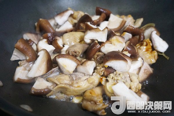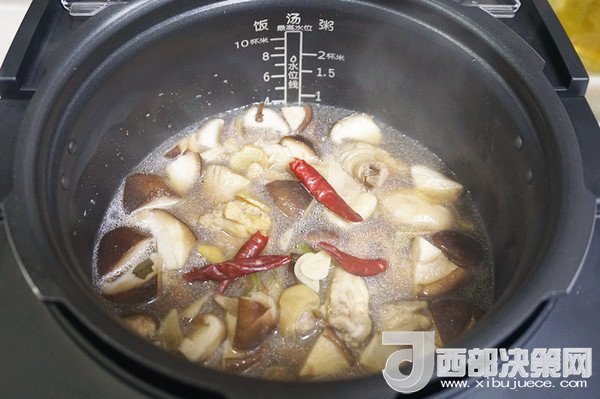 5、再放入香菇塊,加入沒(méi)過(guò)食材的開(kāi)水。所有食材都倒入蘇泊爾電壓力鍋的內(nèi)膽中。