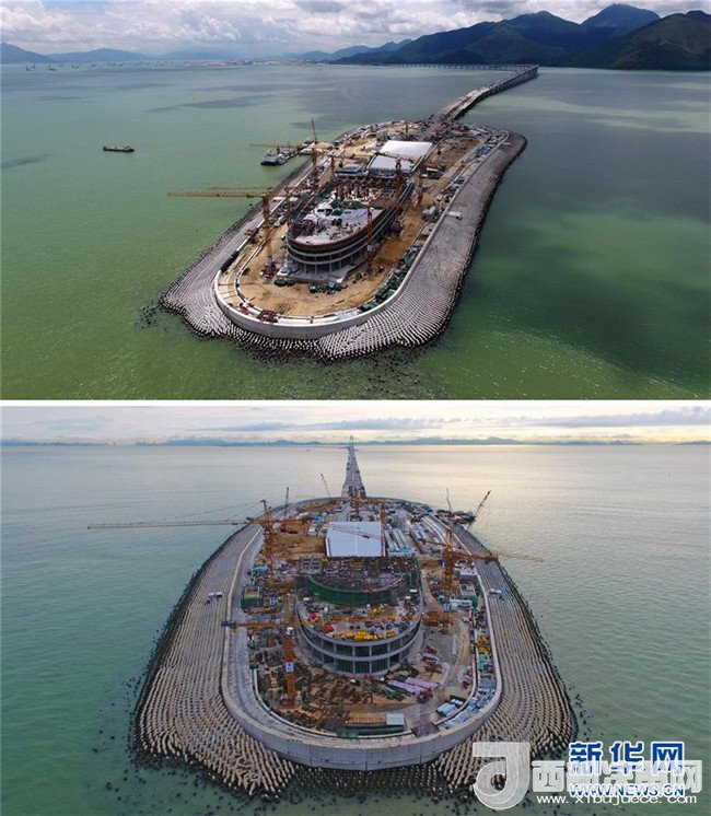 港珠澳大橋主體工程的人工島拼版照片。上圖為東人工島,連接香港(2017年7月5日攝);下圖為西人工島,連接主體橋梁,通往珠海、澳門(2017年7月4日攝)。記者 梁旭 攝