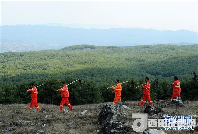 沙子坡林場的護林員在夕陽下巡山歸來(2013年7月7日攝)。