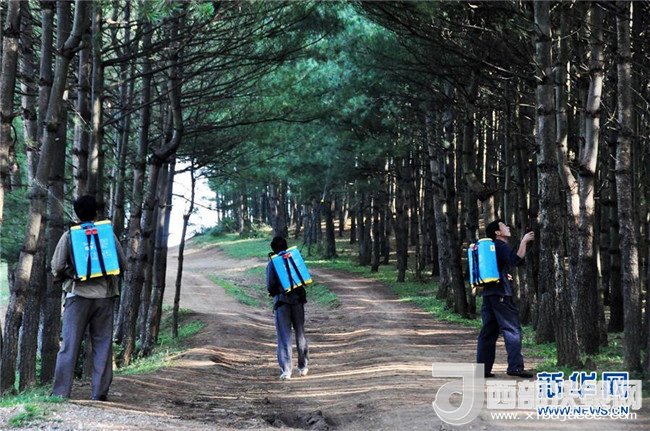 沙子坡林場的護林員在林區(qū)內(nèi)噴灑藥劑防治病蟲害(2013年7月8日攝)。