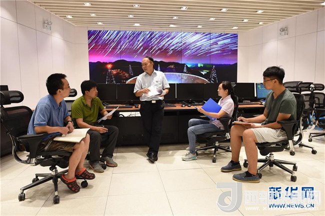 工作人員在FAST總控室內(nèi)交流(2017年8月10日攝)。