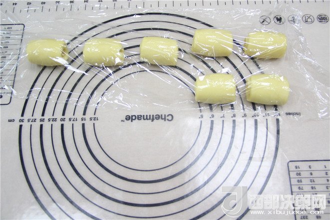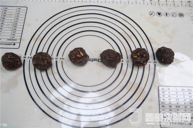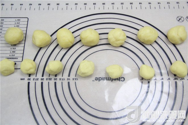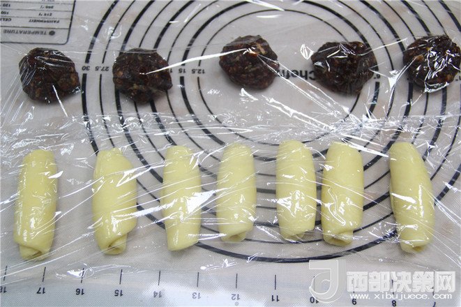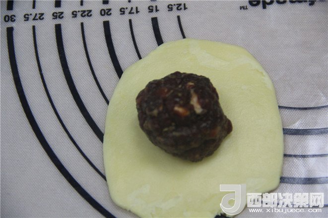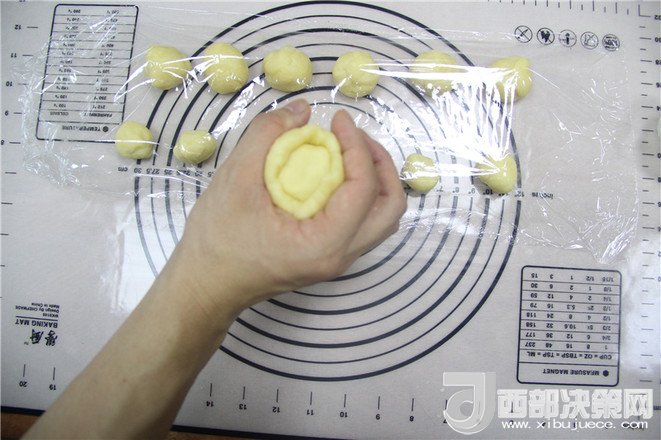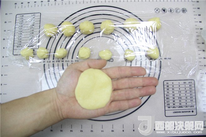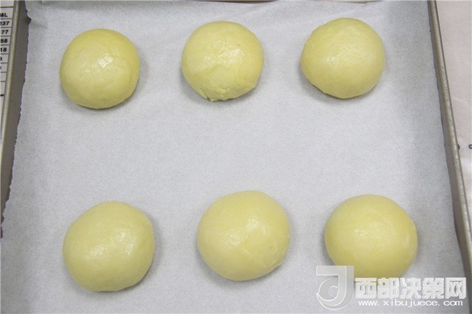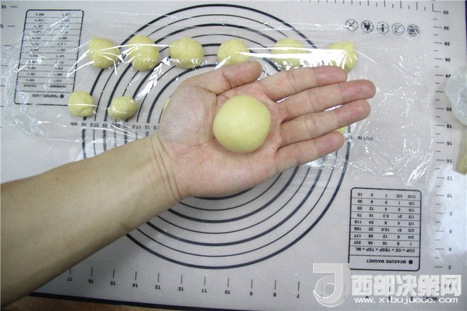 11.把油皮分割成6個25克,油心分成6個20克,分別揉成團(tuán)。