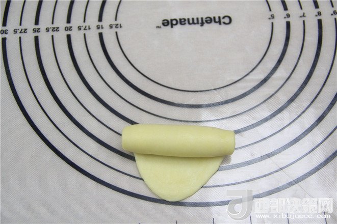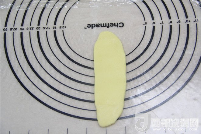 18.油酥面團(tuán)直立放著,然后用搟面杖搟成長條橢圓。