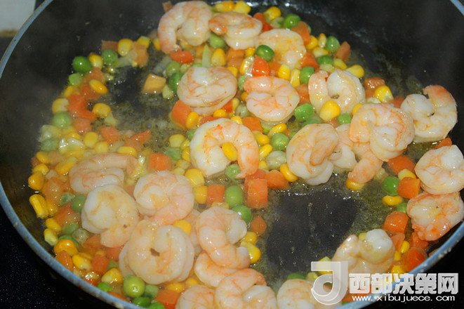 4.鍋里加底油,加蝦仁翻炒。