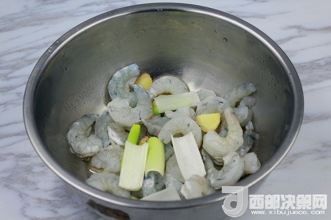 2.蝦仁處理干凈后,加適量料酒,鹽,蔥姜腌制10分鐘