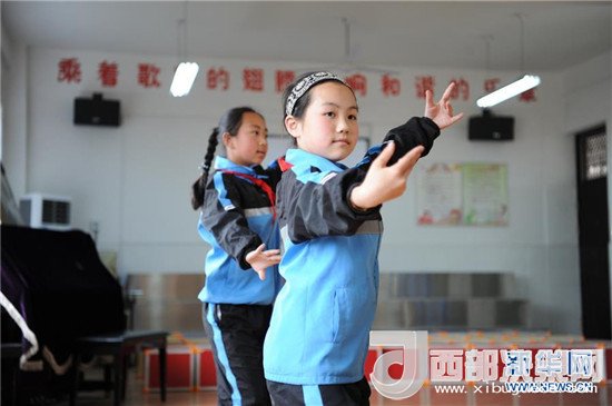 4月25日,陜西省勉縣溫泉鎮(zhèn)中心小學學生在音樂教室內(nèi)進行舞蹈練習。