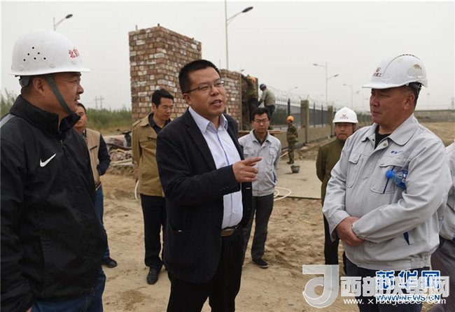 北京援疆干部、墨玉縣委副書記張好生(中)在墨玉縣北京工業(yè)園區(qū)紡織園建設(shè)現(xiàn)場(chǎng)與施工方交談(4月20日攝)。